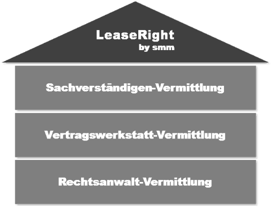 LeaseRight by smm-LeistungenLeaseRight by smm arbeitet noch an der Konkretisierung seiner Produktbeschreibungen, deshalb finden Sie an dieser Stelle momentan nur einen Ausschnitt unserer Leistungen.LeaseRight by smm-Sachverständigen-VermittlungWir helfen Ihnen, sich optimal auf die Rückgabe Ihres Leasingfahrzeuges vorzubereiten. Dafür arbeiten wir nur mit qualifizierten und vereidigten Kfz-Sachverständigen zusammen. Diese untersuchen ihr Leasingfahrzeug auf Beschädigungen und erstellen Ihnen eine detaillierte Aufstellung aller gefunden Mängel sowie der Reparaturen, die notwendig sind, damit Ihr Auto bei der Rückgabe in einem beanstandungslosen Zustand ist.Und wenn Sie nicht alleine zur Fahrzeugrückgabe gehen wollen: Sie können sich auch von Ihrem LeaseRight-Partner-Sachverständigen begleiten lassen. Dann sind Sie sicher, dass dort alles mit rechten Dingen zugeht und Ihnen nichts in Rechnung gestellt wird, wofür Sie gar nicht zahlen müssen.LeaseRight by smm-Vertragswerkstatt-VermittlungDas optimale Reparaturergebnis erhalten Sie nur bei einer qualifizierten Werkstatt. LeaseRight by smmarbeitet deshalb nur mit echten Meisterwerkstätten zusammen, die die Arbeiten an Ihrem Fahrzeug fachgerecht und zu fairen Preisen ausführen. So erhalten Sie Ihr Fahrzeug in einem tadellosen Zustand zurück. Profitieren Sie von unseren günstigen Konditionen.LeaseRight by smm-Rechtsanwalt-VermittlungUnd falls Sie am Ende doch eine Rechnung mit Nachforderungen bekommen: LeaseRight by smm vermittelt Ihnen kompetente Rechtsanwälte, die täglich solche Fälle verhandeln und schon hunderten Mandanten zu ihrem Recht verholfen haben.LeaseRight by smm-Ihre VorteileLeaseRight by smm schont Ihren Geldbeutel und Ihre Nerven. Bei allen Schritten haben Sie volle Flexibilität und können selbst entscheiden, ob und wann Sie unsere Leistungen in Anspruch nehmen. Außerdem ist unser Service für Sie als Kunde kostenlos. Sie bezahlen nur für die in Anspruch genommenen Leistungen und sonst keinen Cent.